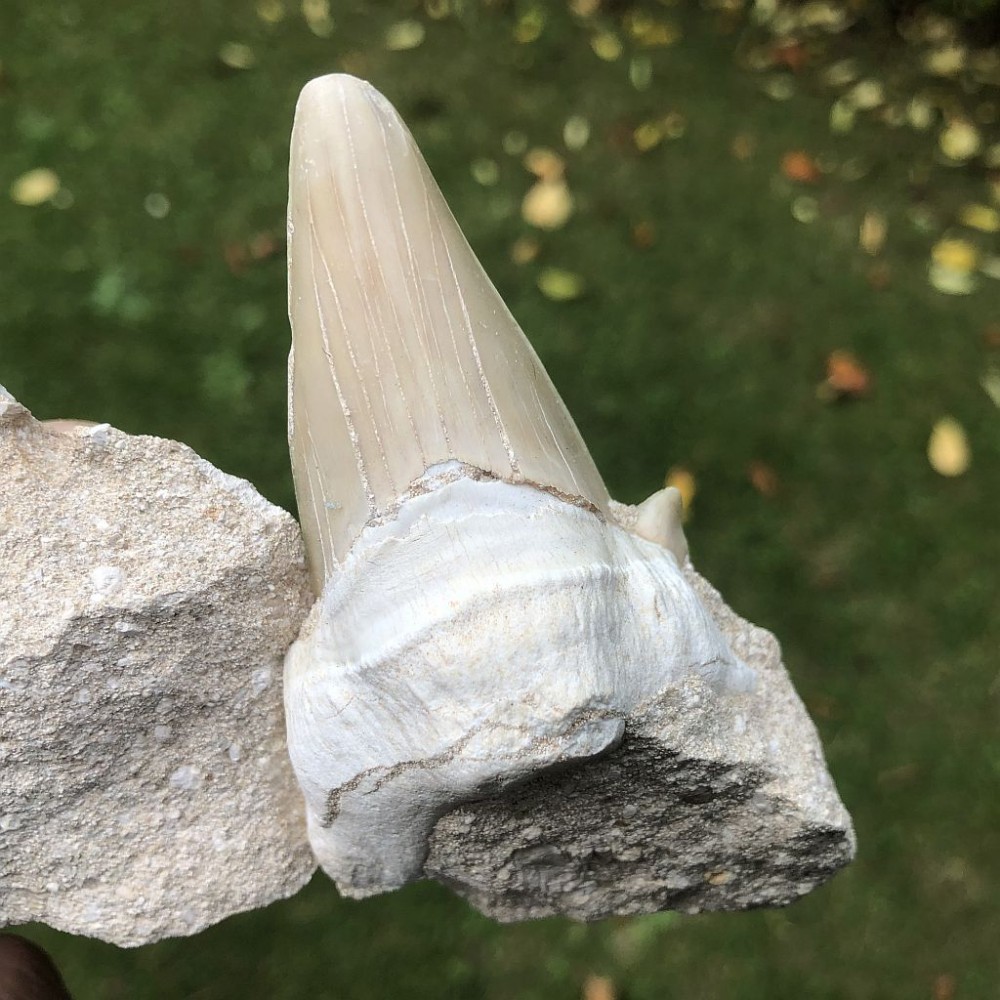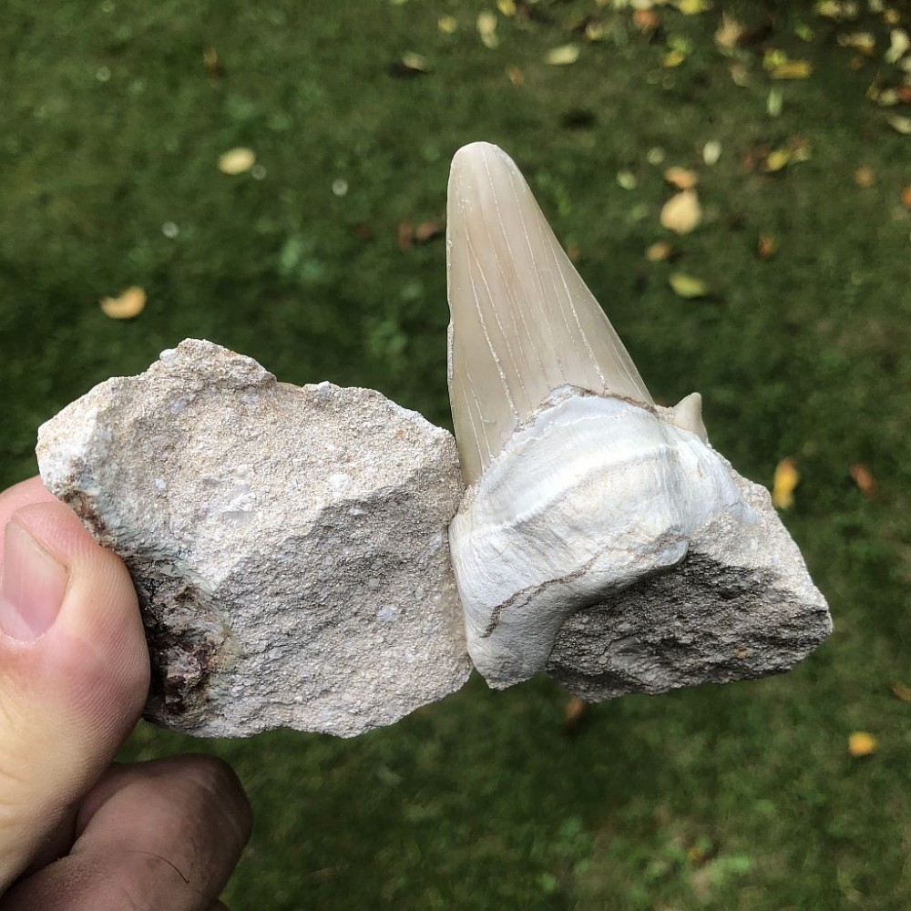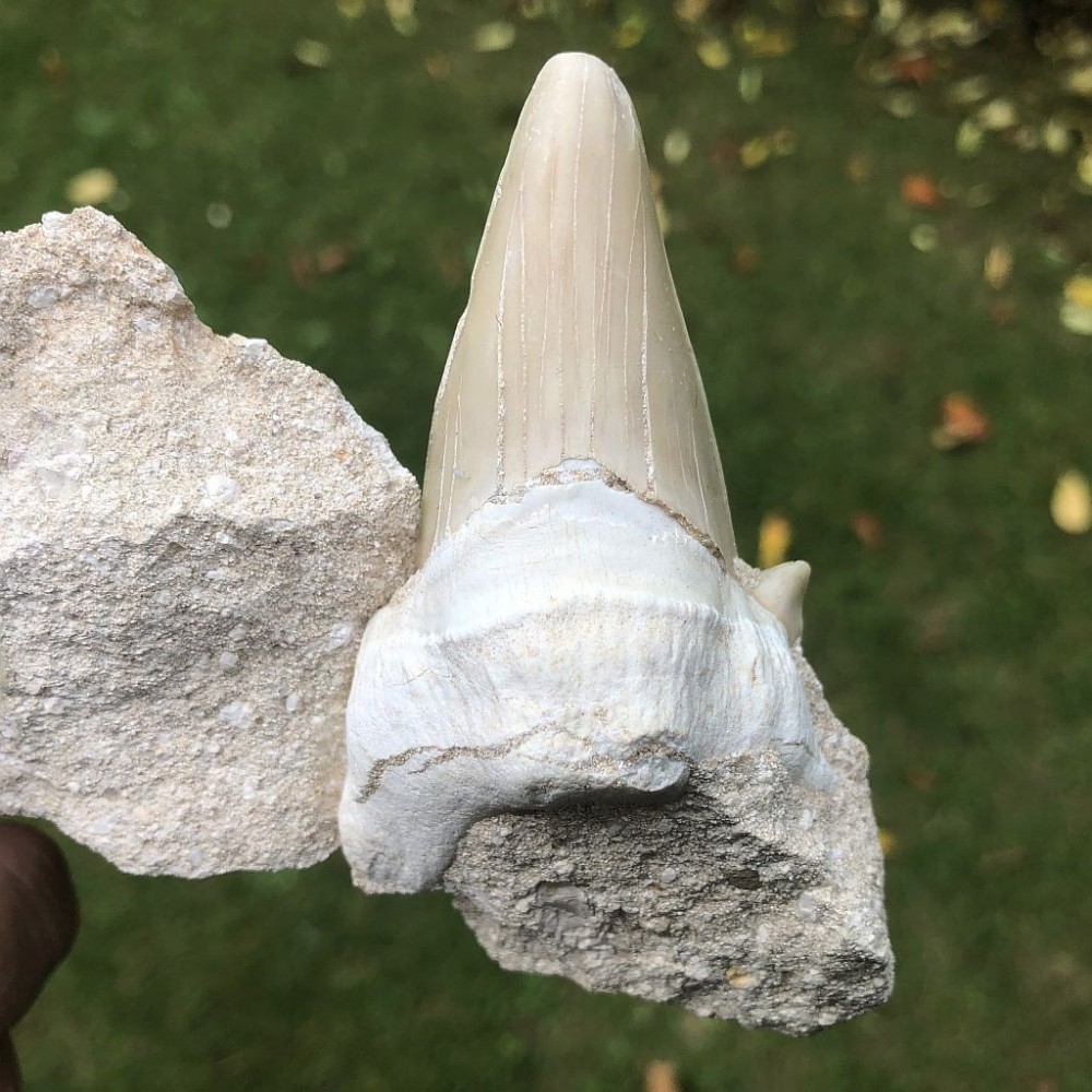 Zub žraloka (6 cm) zachovalý v původní matečné hornině. Naleziště Khouribga, Maroko. Třetihory, eocén (cca 50 mil. let).