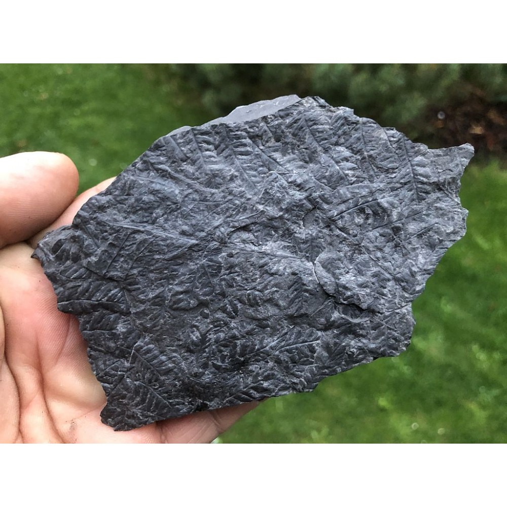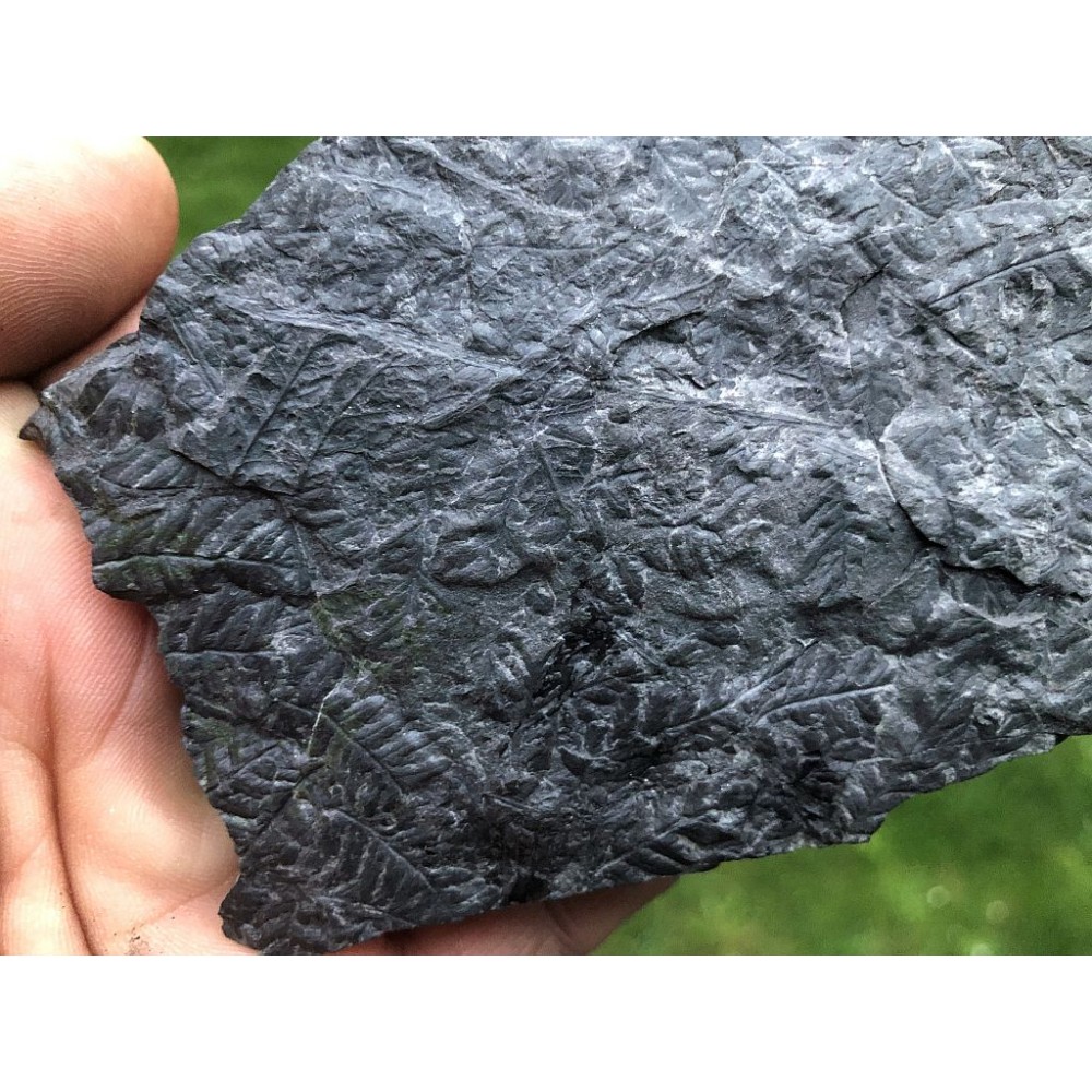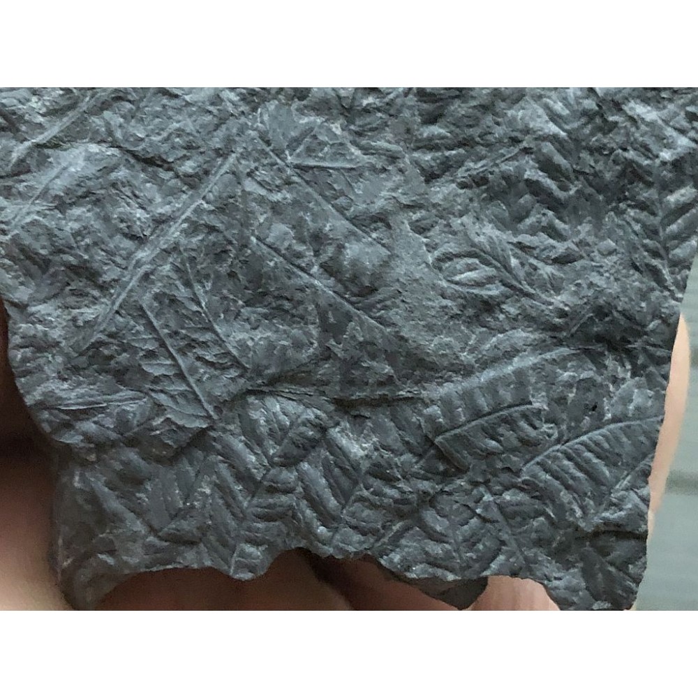 Vzorek posetý hojnými otisky listů karbonské kapradiny druhu Senftenbergia plumosa. Vzorek pochází z odvalu dolu ČSM u Karviné, uvádí se též Stonava.