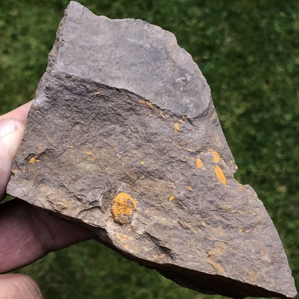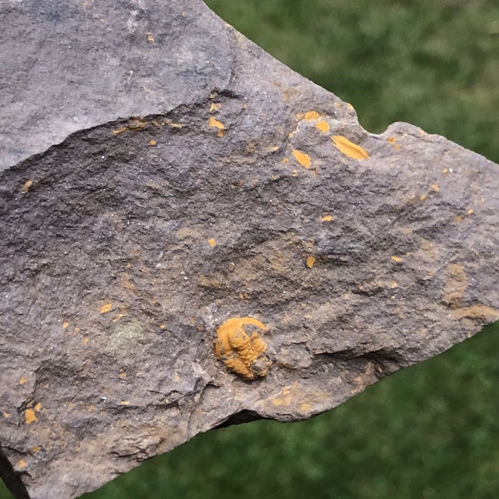 Téměř kompletní trilobit Skreiaspis spinosa z lokality Rejkovice - Ve žlutých. Má pouze trochu odloupnutou limonitovou krustu, která mu dává charakteristické zbarvení pro tuto lokalitu. Velikost trilobita je 1 cm.