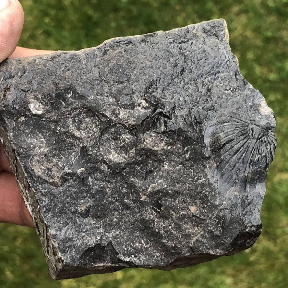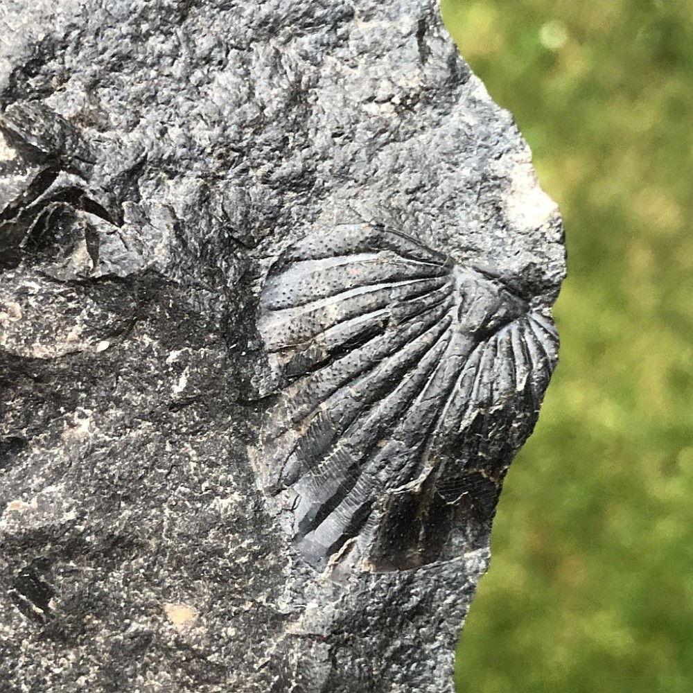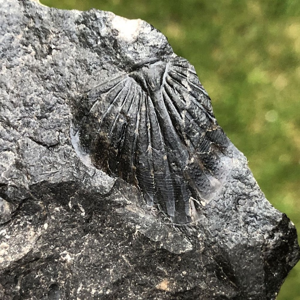 Ocasní štít trilobita druhu Spiniscutellum umbeliferum na vzorku z lokality Praha - Lochkov. Spodní devon.
