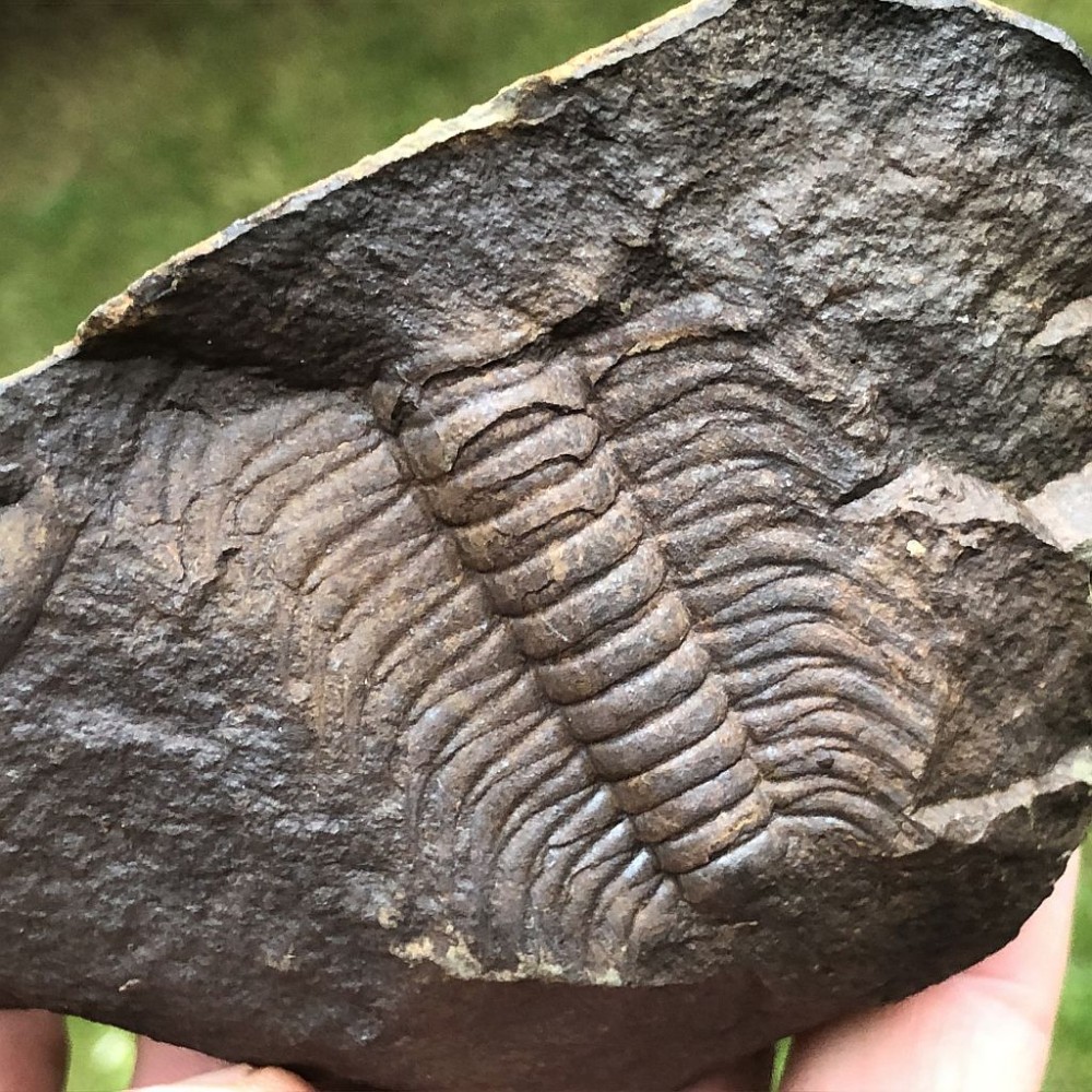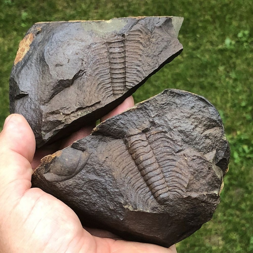 Část trupu (3,5 cm) trilobita Paradoxides gracilis na vzorku, který sestává ze dvou částí, pozitivu a negativu. Vzorek pochází z lokality Rejkovice.
