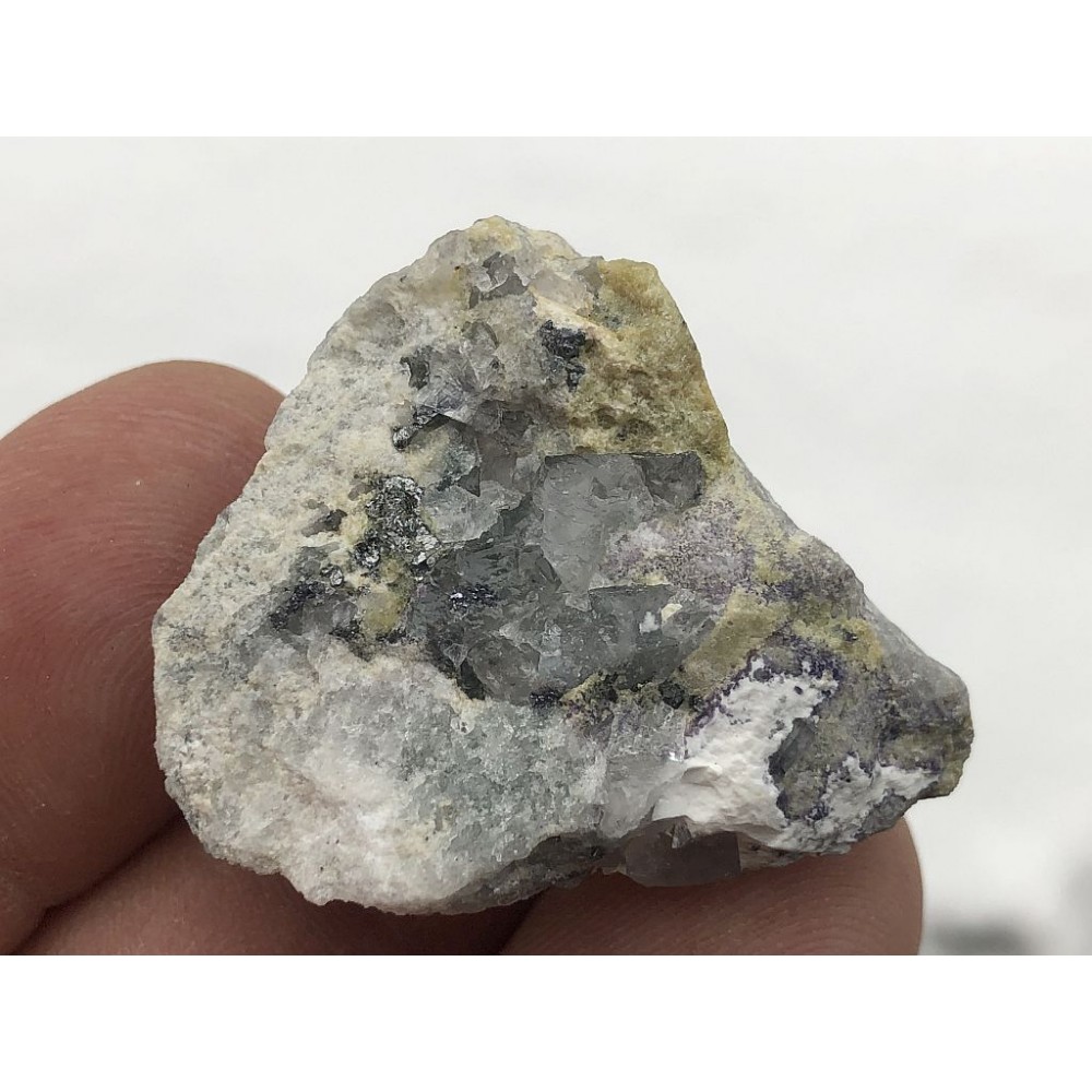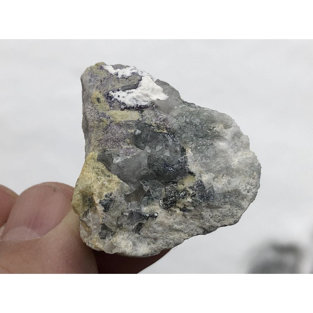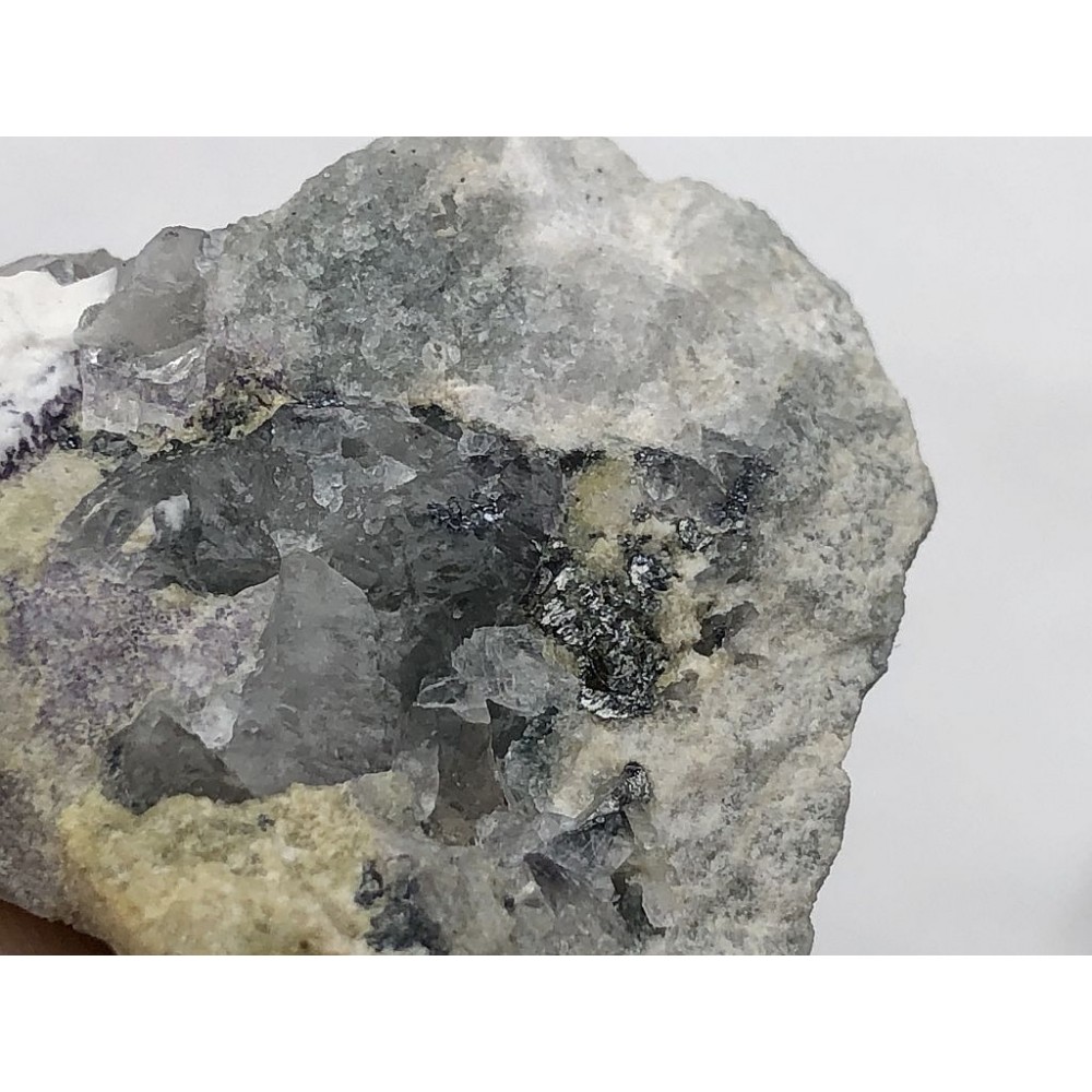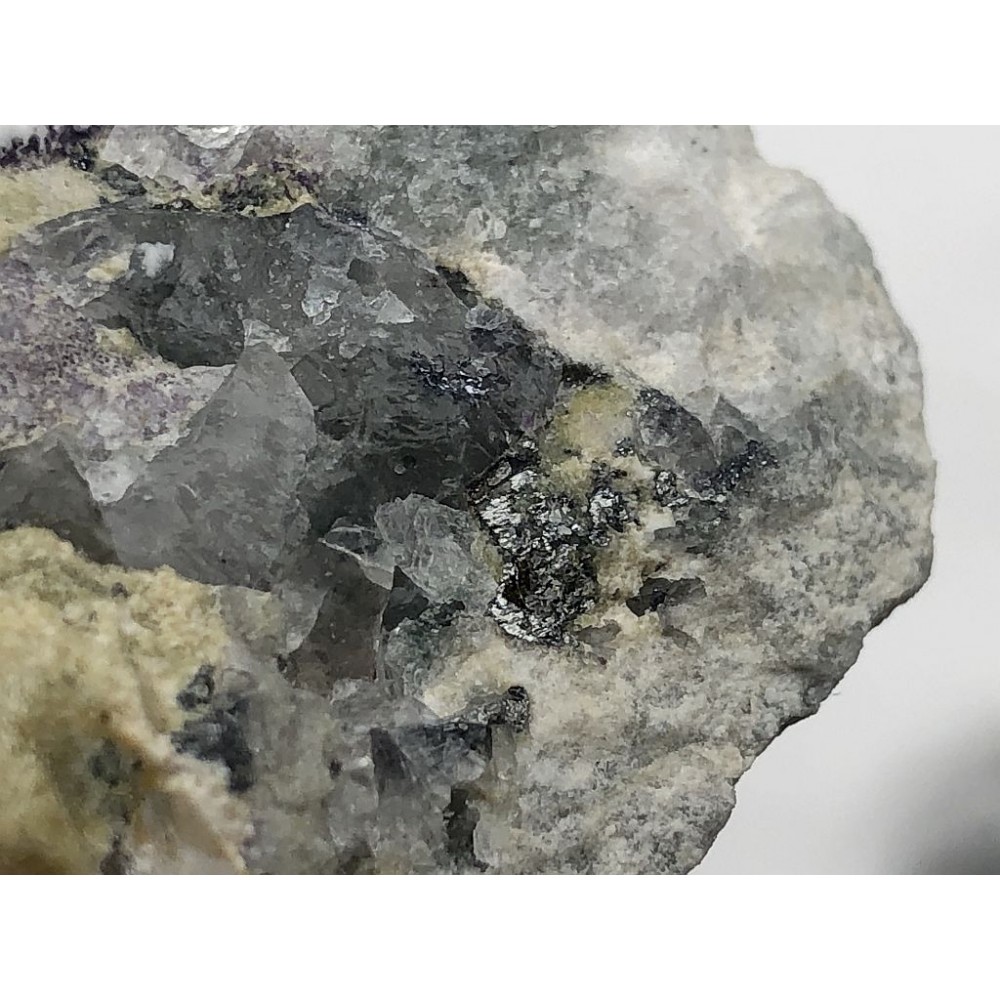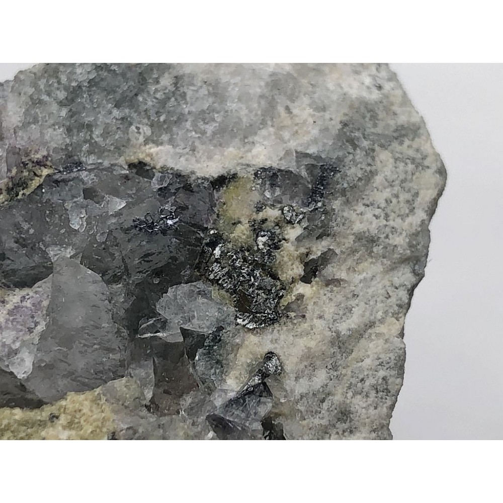 Menší vzorek křemenné žiloviny s drobnými zarostlými kovově šedými zrny vzácného minerálu krupkaitu z lokality Krupka ze štoly Barbora.