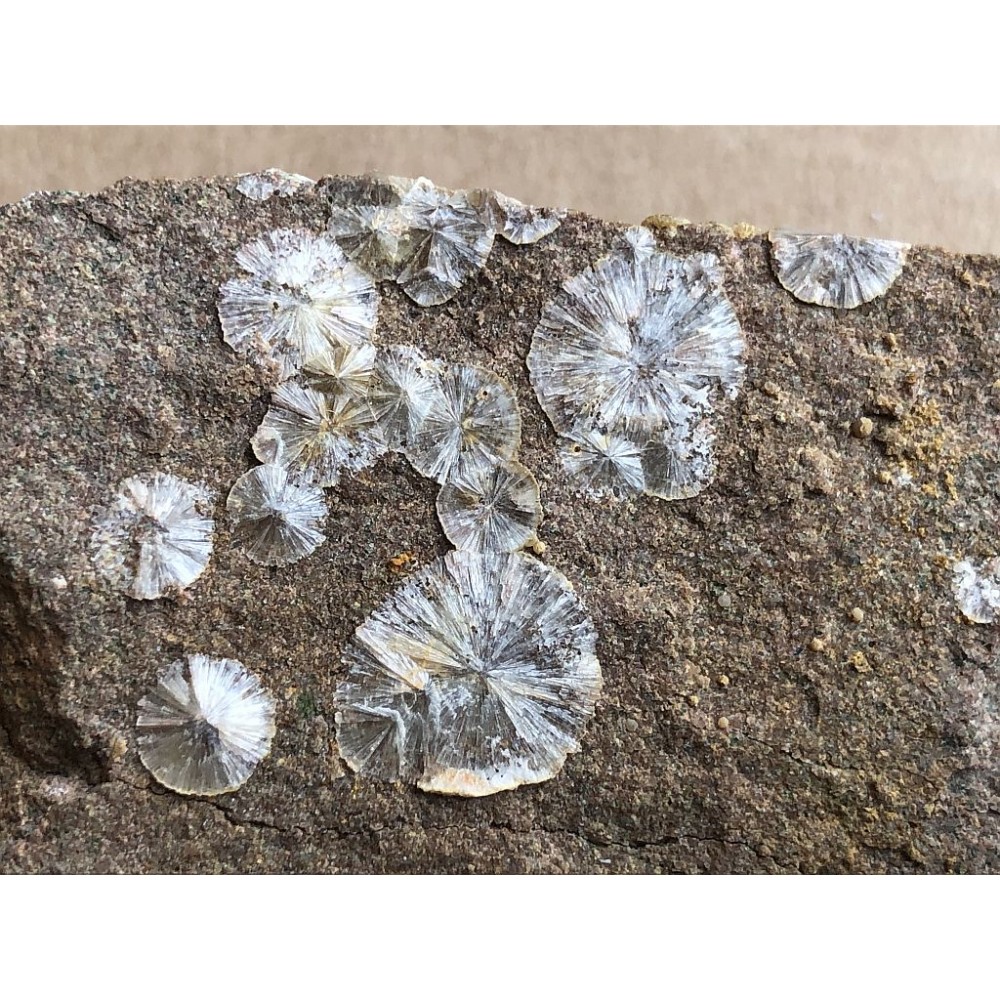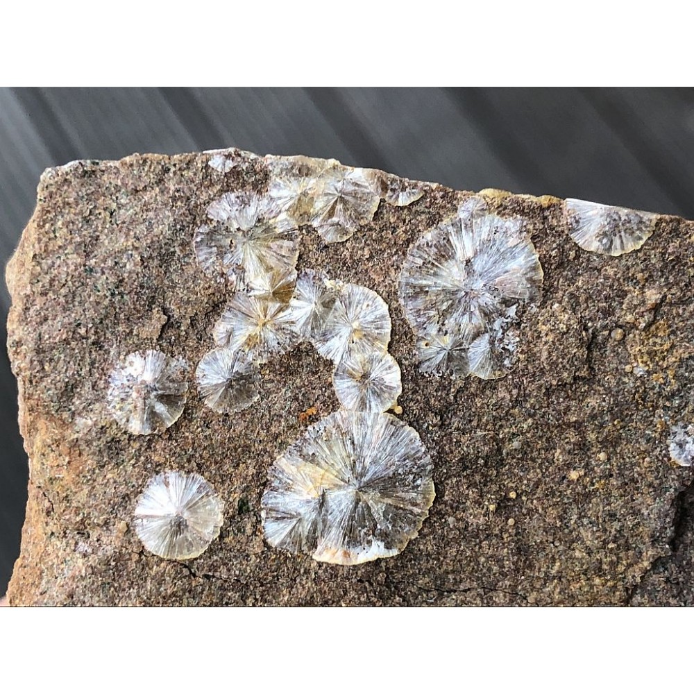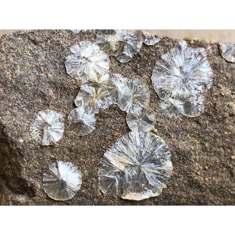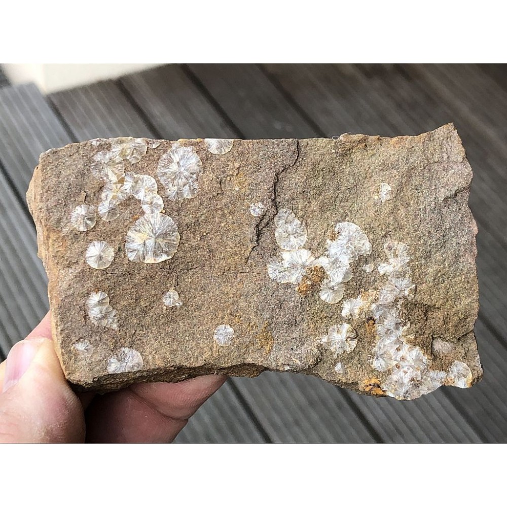 Radiálně paprsčité agregáty, tzv sluníčka bílého wavellitu na puklinách droby z lokality Třenice. Sluníčka do max. velikosti 1,2 cm. Rok nálezu: 2007.